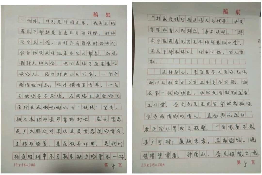 评语:红色是热血的颜色,是五星红旗的颜色,更是中国的颜色。作品感情奔放,语言流畅,具有很强的感染力,字里行间充满了对“逆行者”们的热爱。