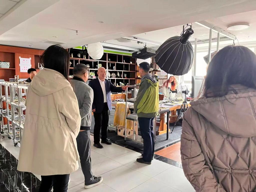 本次调研参观学习了2021年9月正式入驻岫岩的抖音直播基地东北运营中心。作为东北三省地区唯一一家珠宝文玩玉石直播基地,该中心是集原石开采、玉石雕刻、产品销售、玉石文化宣导为一体的完整玉石产业链科技创业中心。其依托“政府搭桥、企业联合、市场运作”模式,充分发挥抖音集团的平台功能与带动效应,吸引五湖四海的企业对接抖音、集聚岫岩,以数字经济为企业发展赋能。截至目前,中心已入驻商户5100余家,开设店铺186个,成功孵化账号4965个,吸引2000余名电商主播入驻,带动本地1万余人实现就业,2023年基地交易额约达53亿元。