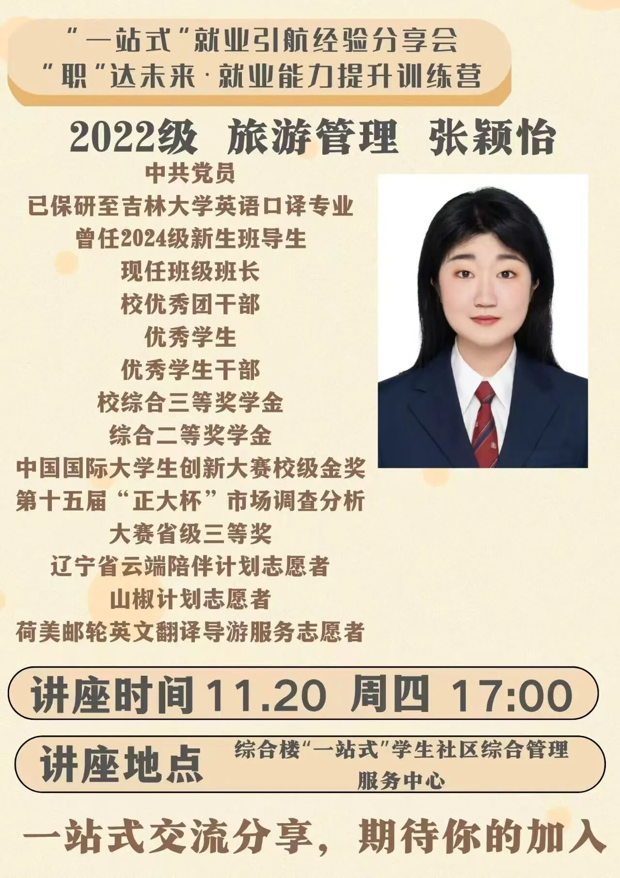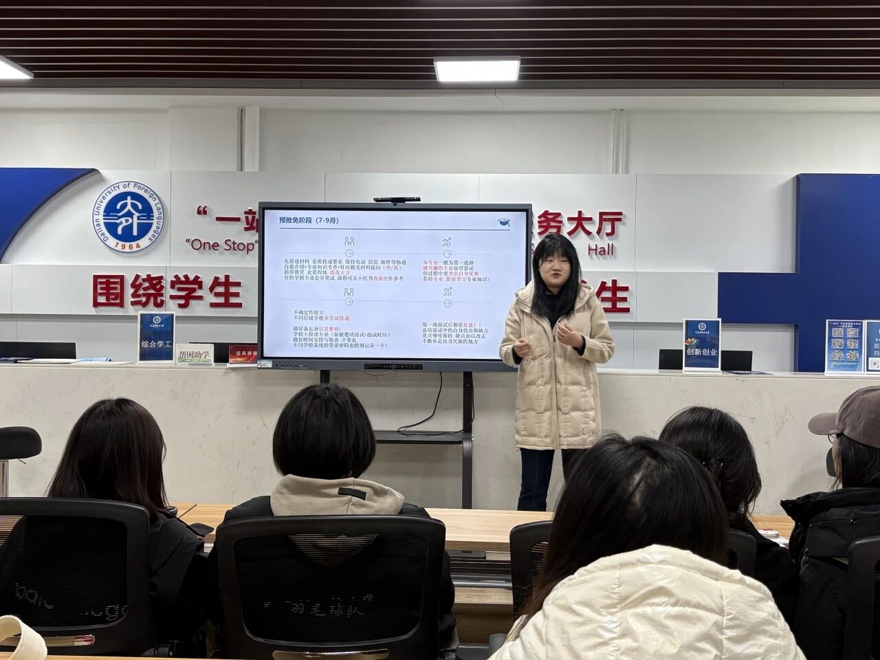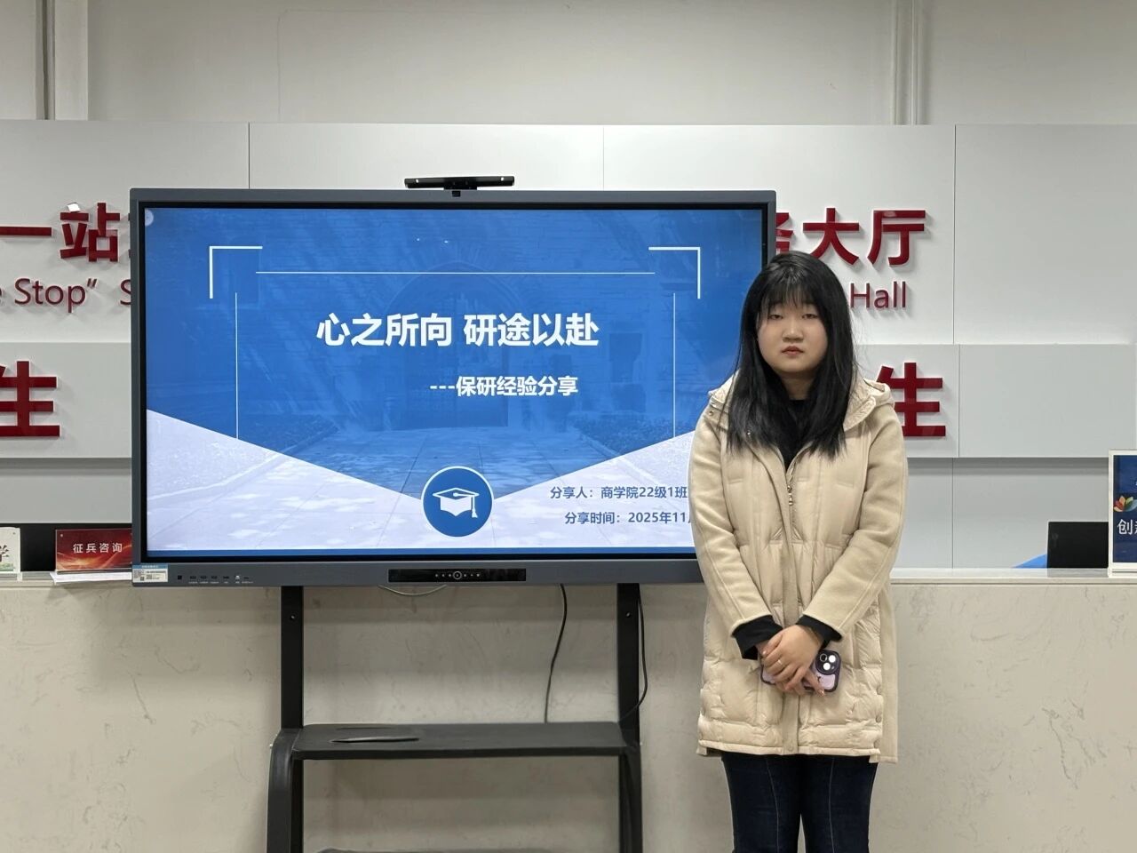 11月20日,商学院于“一站式”学生社区综合管理服务中心开展“一站式”就业引航“职”达未来·就业能力提升系列活动第九期——保研经验分享会,本次分享会由22级1班的张颖怡同学主讲。
