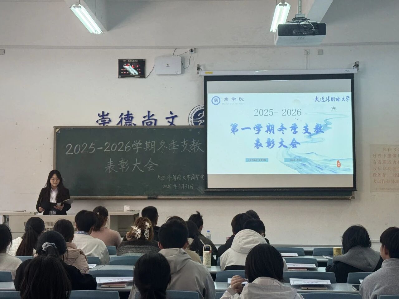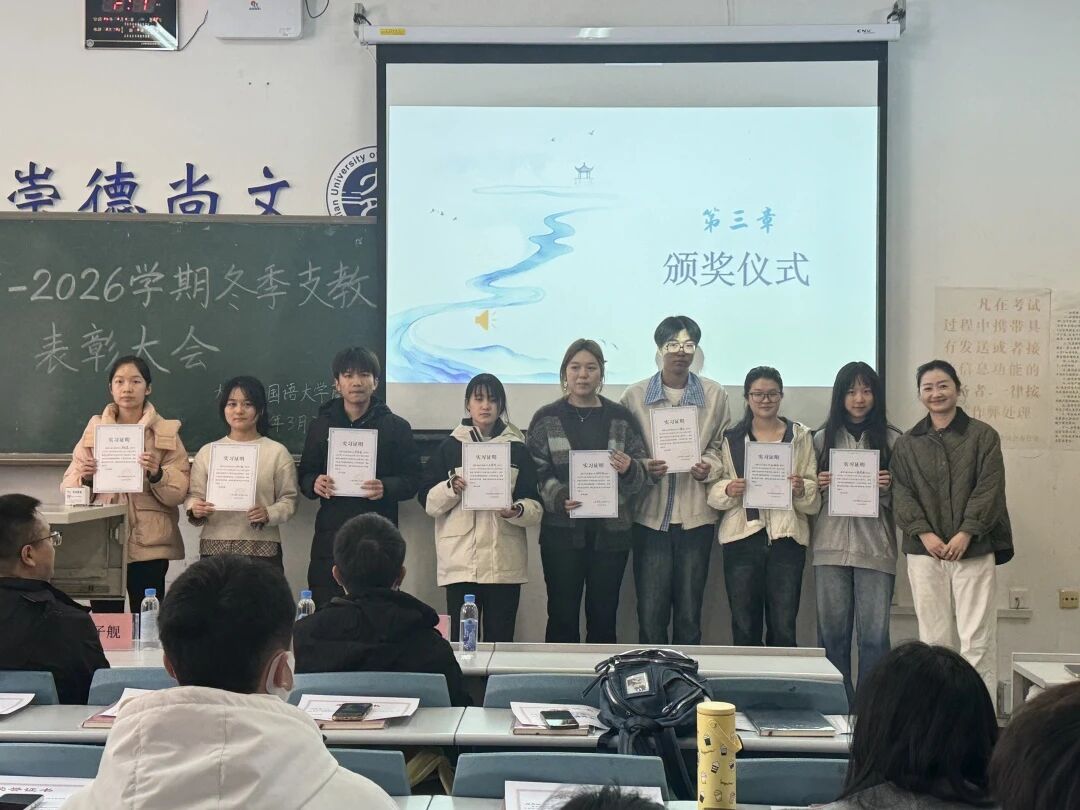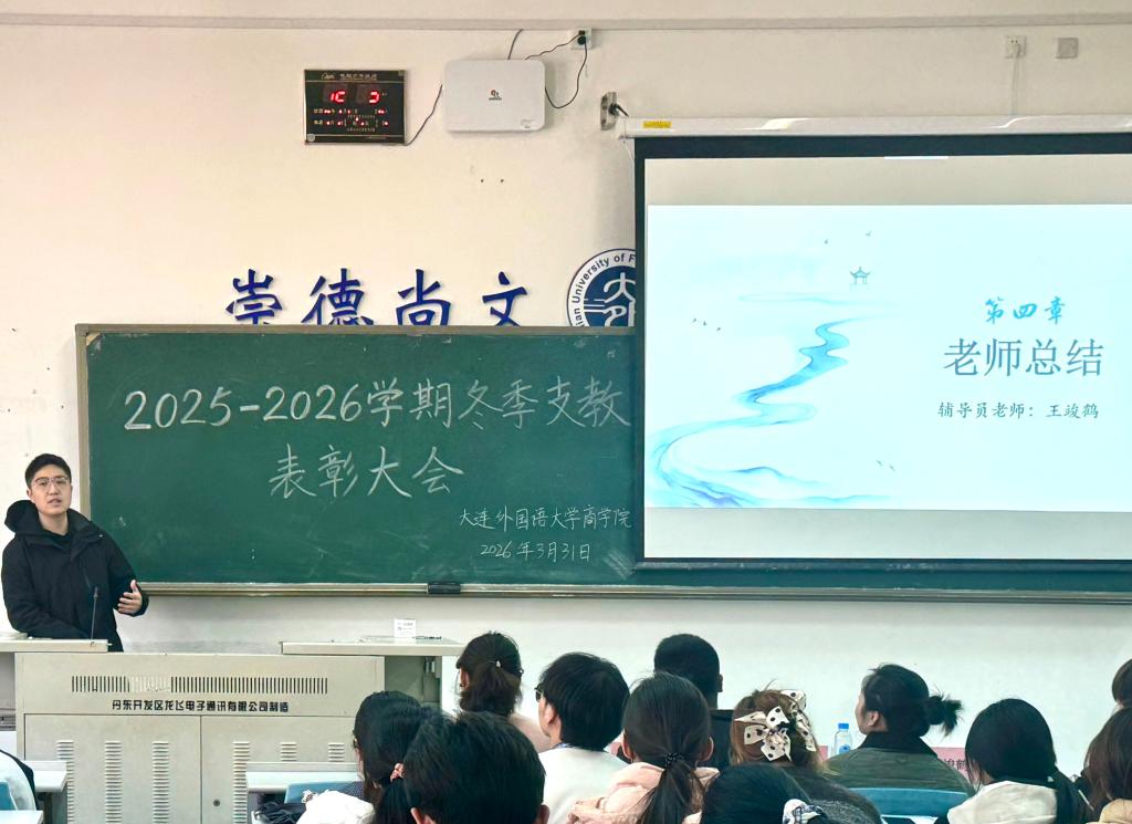 为表彰2025年冬季支教活动中表现突出的志愿者,弘扬志愿服务精神,引导商学院学子积极参与社会实践、提升综合素养,3月31日,商学院于明德楼104教室举办“聚冬日微光,燃支教星火”支教表彰暨动员大会。商学院2022级辅导员于子舰、2024级辅导员潘博、2025级辅导员王竣鹤,以及全体志愿者出席此次大会。