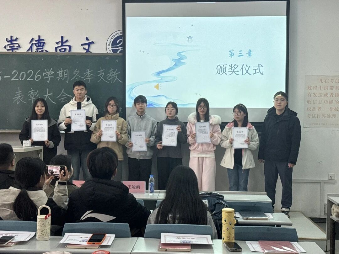 大会颁奖环节,商学院2022级辅导员于子舰、2024级辅导员潘博、2025级辅导员王竣鹤依次为获奖同学颁发“优秀志愿者”荣誉证书及实习证明,向全体支教志愿者的辛勤付出与无私奉献表示诚挚感谢与充分肯定。都只为让知识传递更高效,让学生成长更扎实。